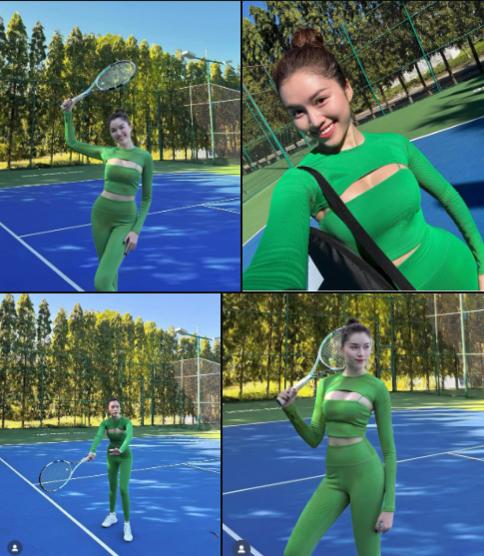 MC Thanh Thanh Huyền khoe dáng trên sân tennis trong thiết kế đồ tập tôn dáng, thu hút nhiều lượt yêu thích trên MXH. Cô lựa chọn trang phục màu xanh lá, chất thun tăm với độ co giãn lý tưởng, tạo độ thoải mái trong quá trình vận động, di chuyển. Điểm nhất của outfit chính là chiếc áo tập có kiểu dáng khá đặc biệt, bao gồm áo 2 dây và 1 chiếc siêu croptop tạo khoảng hở cố định khi mix ở bên ngoài.