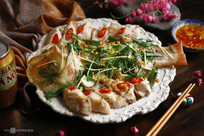 Hấp cá và hoàn thiện: Cho nước vào khoảng 1/4 nồi đun sôi, trút ⅔ lon bia vào rồi đặt vỉ cho cá vào hấp cách thủy. Vì cá đã lọc nên hấp nhanh chín hơn cá để nguyên con. Sau 10 - 12 phút là cá chín, rắc hành lá, thì là vào để hấp vài phút cho rau thơm chín tới là được. Lấy cá ra, rắc chút tỏi phi lên trên cho thơm và thêm phần bắt mắt. Cách pha nước mắm gừng chấm cá: Cho gừng, tỏi, ớt cùng chút đường vào cối giã nhuyễn rồi thêm nước mắm, nước lọc sạch, chanh khuấy đều, nêm nếm cho vừa miệng.