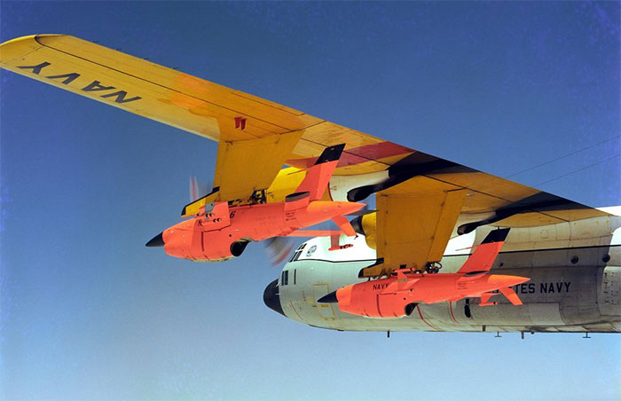 Máy bay DC-130 mang theo hai chiếc máy bay không người lái Ryan Model 147SC. (Ảnh: Không quân Mỹ).