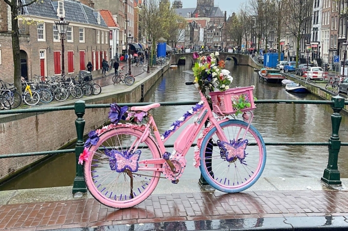 Đi dạo quanh trung tâm Amsterdam, ngắm những chiếc xe đạp hoa rực rỡ sắc màu dựng trên các cây cầu bắc qua kênh là gợi ý đầu tiên dành cho du khách. Những chiếc xe đạp được trang trí bằng hoa vải và sequin, là tác phẩm của Warren Gregory, một người Mỹ sống lâu năm tại thủ đô. Xe đạp hoa nổi tiếng nhờ xuất hiện liên tục trên TikTok, Instagram và các mạng xã hội khác.