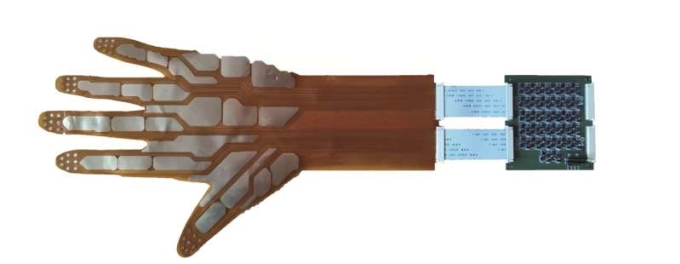 Mạng lưới xúc giác nhân tạo hướng tâm được sử dụng trong phần cứng, cấu tạo từ một loạt các thụ cảm được chế tạo từ màng polyimide hình bàn tay và mạch PCB giúp chuyển đổi tín hiệu thành các chuỗi. Nguồn: Science