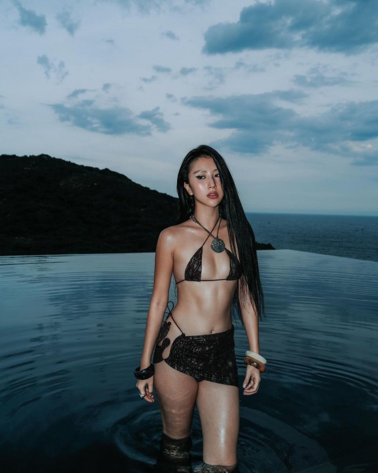 Áo tắm siêu nhỏ phối dây da tạo cho Quỳnh Anh Shyn vẻ cá tính. Người đẹp đầu tư sắm nhiều kiểu đồ bơi kiểu dáng phá cách để thể hiện gu thẩm mỹ riêng.