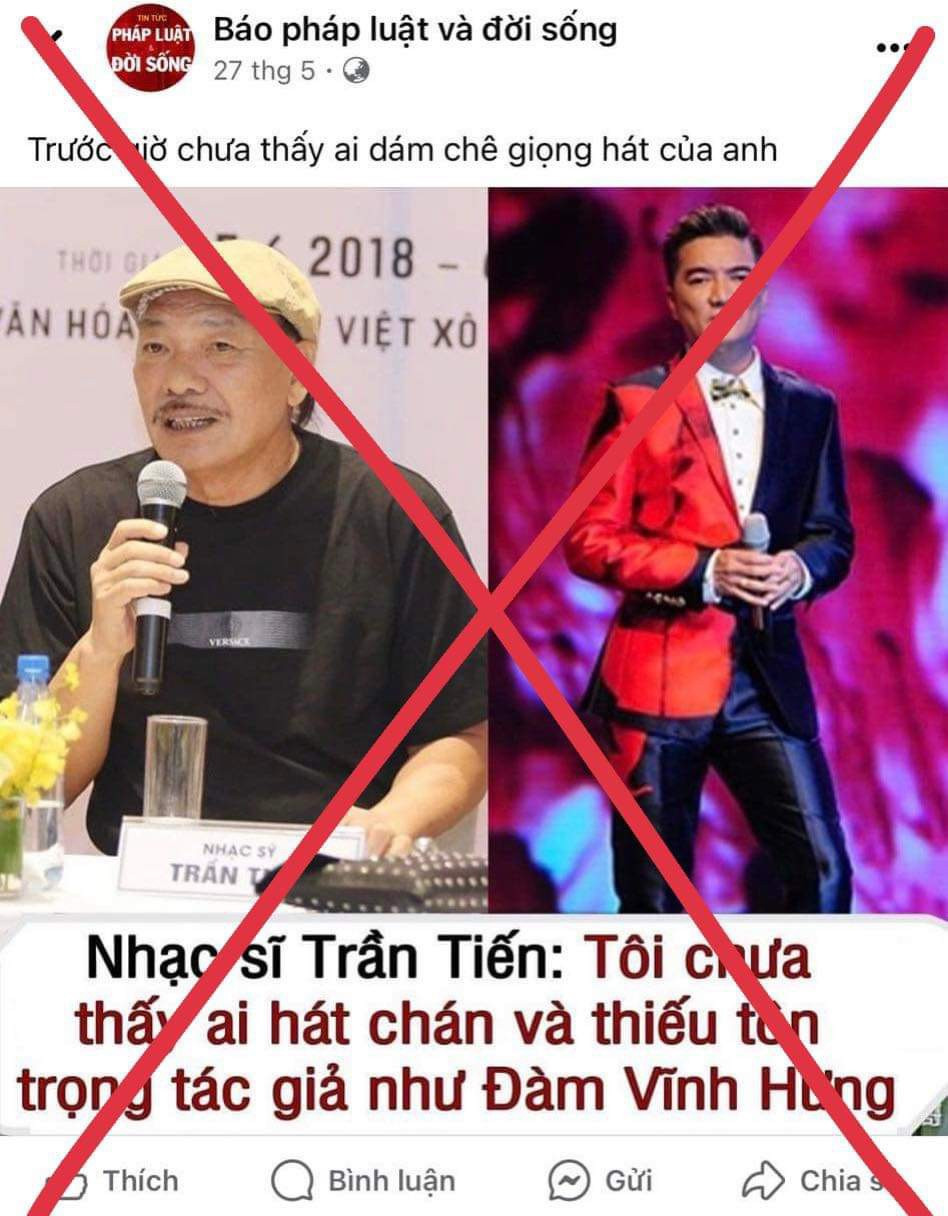 Tài khoản Fanpage Facebook lấy tên “Báo pháp luật và đời sống” đăng tải tiêu đề: “Nhạc sĩ Trần Tiến: Tôi chưa thấy ai hát chán và thiếu tôn trọng tác giả như Đàm Vĩnh Hưng”.
