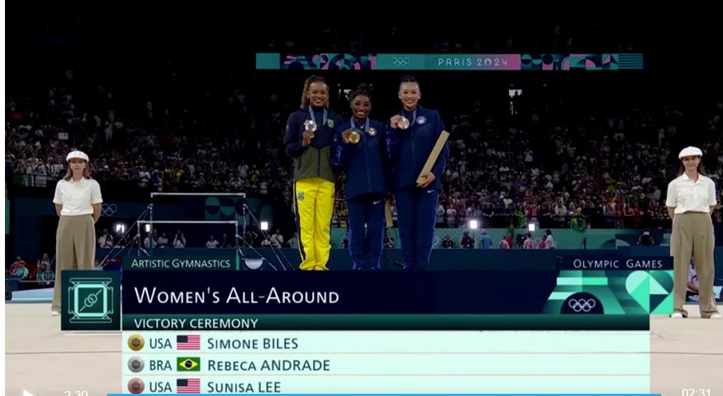 Simone Biles đã giành huy chương vàng ở nội dung thể dục dụng cụ toàn năng cá nhân nữ vào chiều nay khi Thế vận hội Olympic 2024 tiếp tục diễn ra tại Paris. Biles là lực sĩ thể dục dụng cụ người Mỹ đầu tiên giành chiến thắng ở nội dung này hai lần. Biles trở thành người phụ nữ thứ ba và là nhà vô địch toàn năng Olympic hai lần, cùng với Larisa Latynina của Liên Xô vào các năm 1956 và 1960 và Vera Caslavska của Tiệp Khắc vào các năm 1964 và 1968. Đồng đội là cô Suni Lee – người Mỹ gốc Hmong – giành huy chương đồng, trong khi lực sĩ thể dục dụng cụ người Brazil Rebeca Andrade giành huy chương bạc. Các thành viên khác của Đội tuyển Hoa Kỳ là Jordan Chiles, Jade Carey và Hezly Rivera đã được nhìn thấy trên khán đài, sẵn sàng cổ vũ cho đồng đội của mình trước khi nội dung cá nhân bắt đầu. Gia đình của hai lực sĩ thể dục dụng cụ cũng có mặt trong đám đông, cùng với những người nổi tiếng bao gồm Tony Hawk, Seth Rogen và lực sĩ Olympic Steph Curry. 24 lực sĩ, đại diện cho 15 quốc gia, mỗi người đã hoàn thành cuộc biểu diễn trên xà thăng bằng, xà lệch, nhảy ngựa và sàn. Biles và Suni Lee đã vui mừng lao ra khỏi sàn thể dục vẫy cờ Hoa Kỳ sau khi kết quả được công bố. Andrade, đã cùng họ vẫy cờ Brazil.