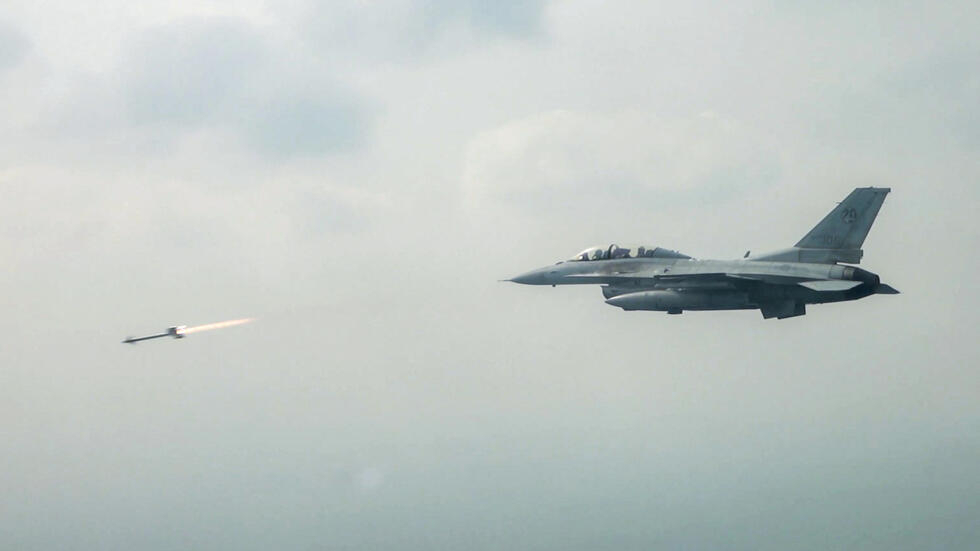 Hình chụp ngày 07/03/2024 do Bộ Quốc Phòng Hàn Quốc công bố: Chiến đấu cơ Air Force KF-16 của Hàn Quốc khai hỏa tên lửa không đối không AIM-9M trong một cuôc diễn tập thường niên với quân đội Mỹ. AFP - HANDOUT