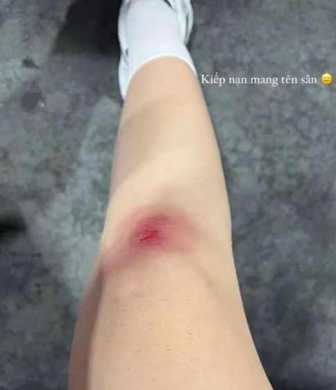 Không còn nuột nà, trắng sáng như mọi lần, một bên chân của Đỗ Thị Hà bất ngờ bị thương tích, bầm đỏ phần đầu gối và rướm máu. Nói về sự việc này, cựu Hoa hậu Việt Nam cho biết: "Kiếp nạn mang tên sân".