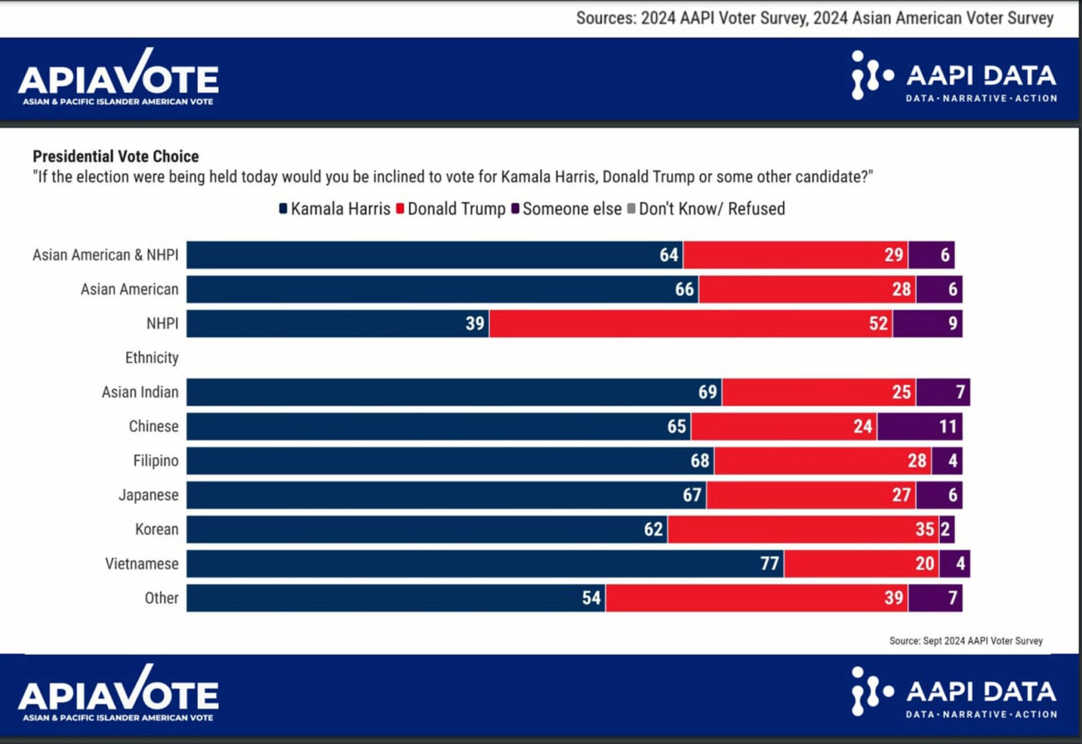 Đối với câu hỏi “Nếu cuộc bầu cử được tổ chức hôm nay, bạn có khuynh hướng bầu cho Kamala Harris, Donald Trump hoặc một ứng cử viên khác?” thì kết quả cho thấy có 66% người Mỹ gốc Á được hỏi trả lời sẽ bầu cho bà Harris, 28% bầu cho ông Trump và 6% bầu cho ứng cử viên khác, cử tri người Mỹ gốc Hawaii và các đảo Thái Bình Dương có 39% bầu cho bà Harris, 52% bầu cho ông Trump và 9% bầu cho ứng cử viên khác.