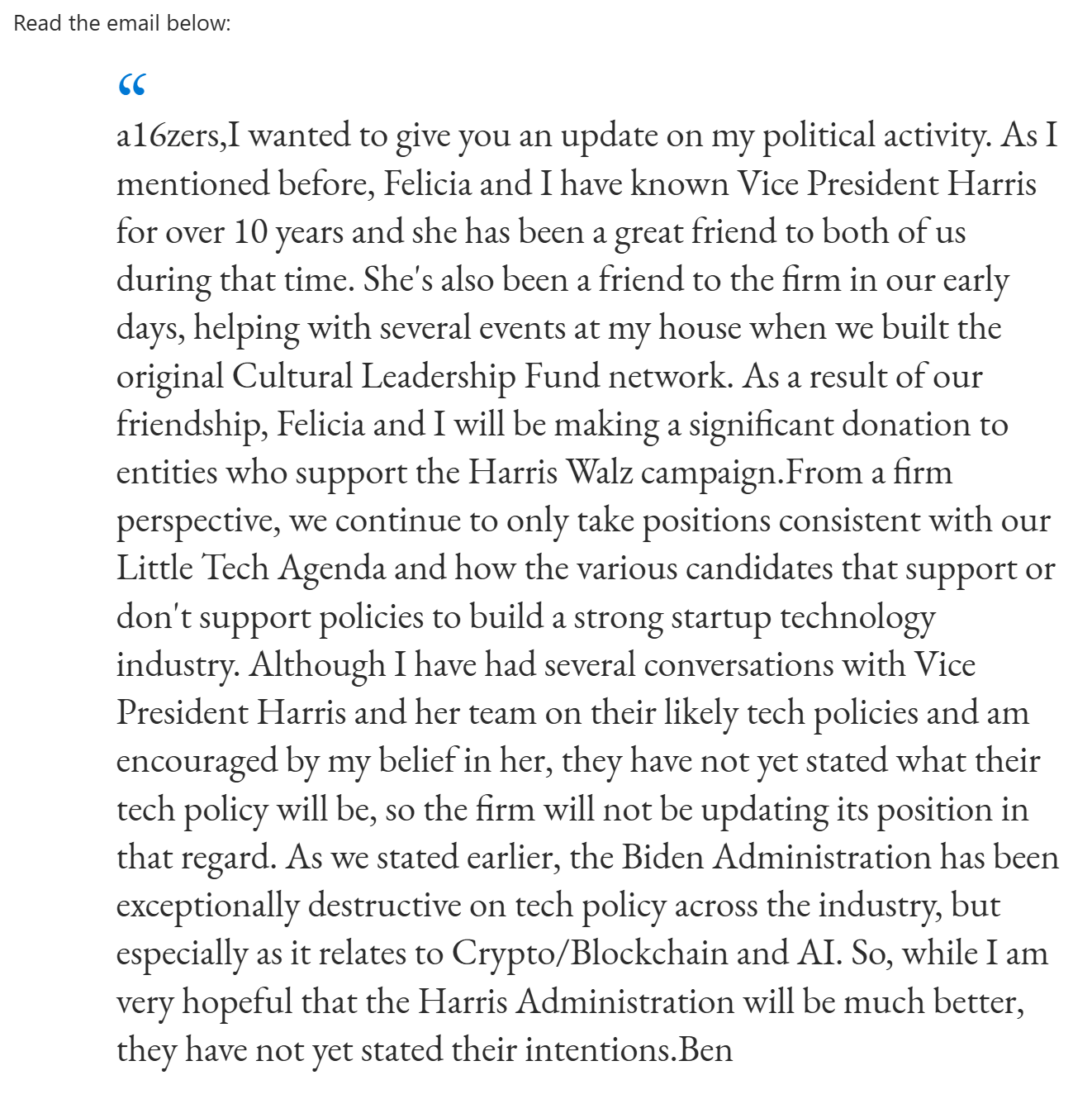“Do tình bạn của chúng tôi, Felicia và tôi sẽ quyên góp đáng kể cho các tổ chức ủng hộ chiến dịch Harris Walz”, theo một email mà Horowitz gửi cho các nhân viên của công ty Andreessen Horowitz vào thứ sáu. Ông nói với các nhân viên rằng, mặc dù chiến dịch Harris vẫn chưa tuyên bố chính sách công nghệ của họ sẽ là gì, nhưng ông “được khích lệ bởi niềm tin của tôi vào bà ấy”.