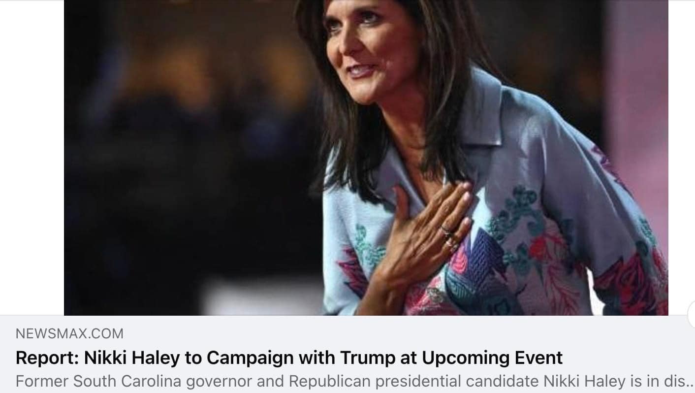 Bà Nikki Haley, cựu thống đốc Nam Carolina và cũng là cựu ứng cử viên Tổng thống của đảng Cộng hòa hiện nay đang thảo luận với uỷ ban tranh cử của ông Donald Trump để bà cùng tham gia với ông Trump tại một sự kiện vận động tranh cử của liên danh Trump-Vance sắp tới.