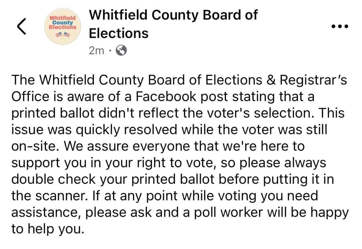 Sau khi dân biểu Greene loan báo tin này. Ban bầu cử của quận cho biết đã sửa lại máy móc ngay sau đó và yêu cầu cử tri xem xét lại kỹ lưỡng phiếu bầu.