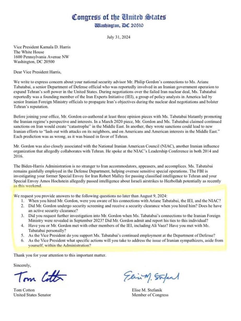 Thêm: Điều đáng nói hơn nữa là Nghị sĩ Tom Cotton và Dân biểu Elise Stefanik đại diện cho Quốc hội Hoa Kỳ đã gửi thư cho Kamala Harris từ ngày 31/7/2024 để cảnh báo về mối quan hệ đáng lo ngại giữa Philip Gordon và bà Tabatabai.