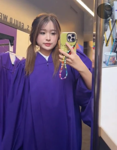 Trong video, cô ghi lại cảnh đi chụp ảnh tốt nghiệp trong bộ trang phục màu tím đặc trưng của ngôi trường. Trong khi các bạn cùng khóa sẽ ra trường năm 2025, cô đã tốt nghiệp vào mùa hè năm nay.