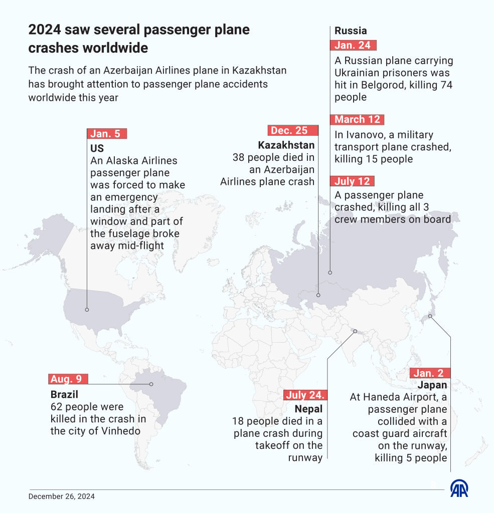 Chiếc máy bay chở khách Embraer-190 đang bay từ thủ đô Baku của Azerbaijan đến Grozny, thủ đô của Chechnya, chở theo 67 người vào ngày Giáng sinh th́ bay chệch hướng hàng trăm dặm và rơi xuống gần thành phố Aktau ở Kazakhstan.