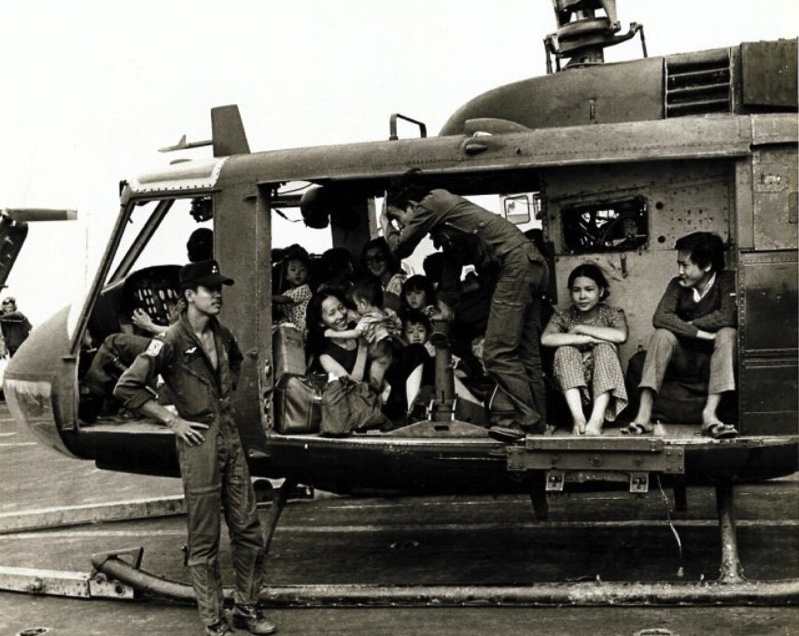 Một chiếc trực thăng UH1 của Không quân VNCH rất cũ không có cửa và mất cả nắp che vách bên trong máy bay, chở gia đình của phi hành đoàn đáp trên hàng không mẫu hạm của Đệ Thất Hạm Đội.