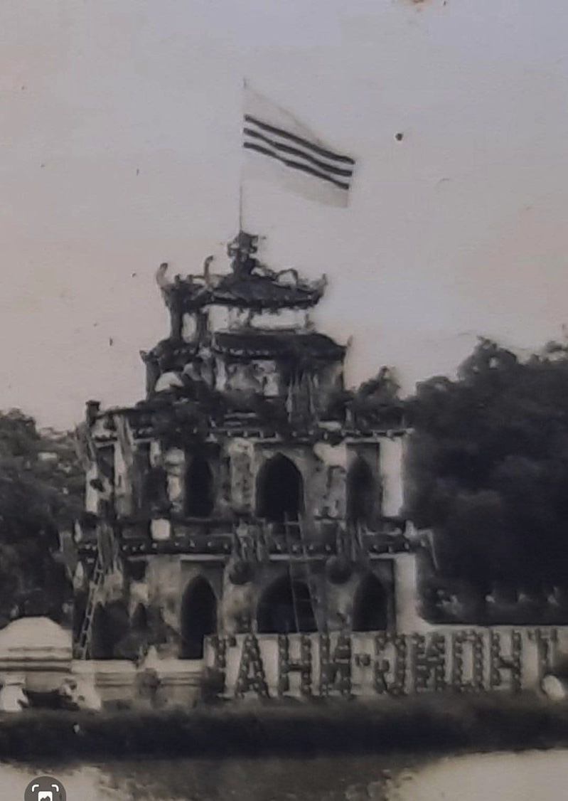 Trong ảnh, trên nóc tháp rùa hồ Hoàn Kiếm có cắm lá cờ vàng 3 sọc đỏ.