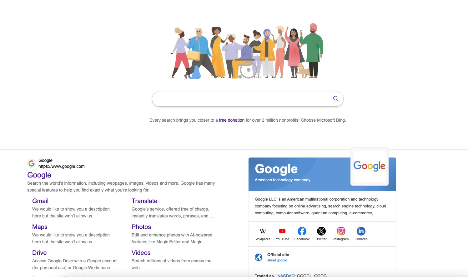 Windows Latest chỉ ra rằng, khi bạn tìm kiếm "Google" trên Bing, trang kết quả sẽ hiển thị một giao diện cực kỳ giống Google. Tuy nhiên, đây chỉ là trang kết quả của Bing với một ô tìm kiếm lớn được chèn trên cùng. Khi nhập từ khóa vào ô này, bạn thực chất đang sử dụng công cụ tìm kiếm Bing chứ không phải Google.