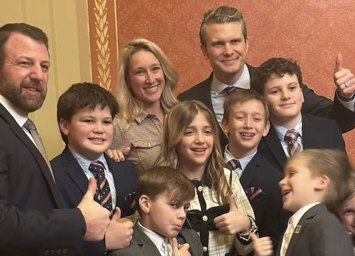 Ông Pete Hegseth (phải) ăn mừng cùng nghị sĩ Markwayne Mullen và vợ con. Ảnh: PeteHegseth/X