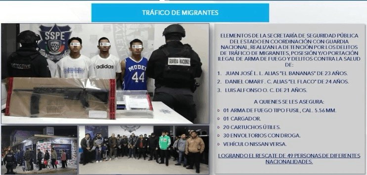 Theo Đài Fox 5 San Diego, cảnh sát thành phố Juarez, Mexico, thông báo đã bắt giữ ba đối tượng bị cáo buộc giam giữ trái phép 49 người di cư tại một ngôi nhà ở khu vực Colonia Hidalgo. Các nạn nhân bị đe dọa bằng một khẩu súng trường M-1 Carbine và buộc phải trả thêm tiền để được tiếp tục hành trình đến Mỹ.