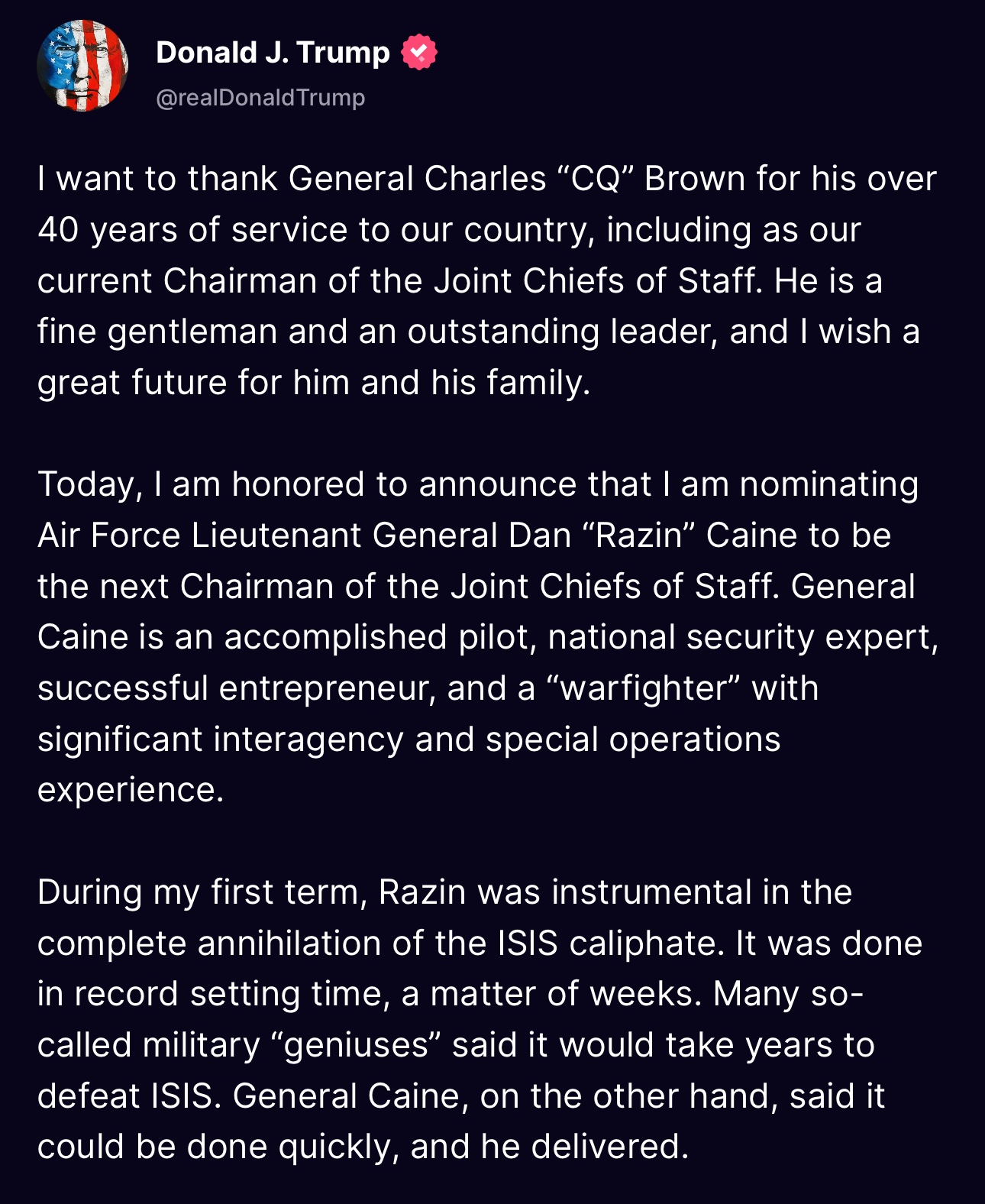 -Chỉ vài dòng trên Truth. Tổng tham mưu trưởng Đại tướng Charles Brown đã về vườn đuổi gà. Ông Trump không chịu hỏi