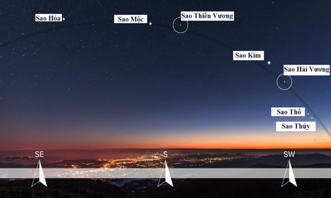 Điểm quan sát của chúng ta trên Trái Đất nằm dọc một trong những rãnh đó. Trong tuần này, tất cả hành tinh còn lại trong hệ nằm ở vị trí khiến chúng xuất hiện trên bầu trời lúc hoàng hôn từ gần như bất kỳ nơi nào trên Trái Đất. Quanh thời gian cuối tháng, sao Thổ sẽ nằm thấp hơn đường chân trời, gia nhập đường thẳng. Người yêu thiên văn sẽ có cơ hội quan sát hiện tượng tương tự trong tháng 8, khi những hàng xóm của Trái Đất trong hệ có thể thấy rõ trên bầu trời buổi sáng.