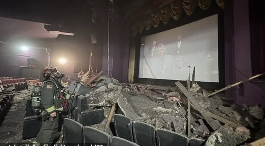 Những hình ảnh từ hiện trường cho thấy thạch cao, tường thạch cao và vật liệu cách nhiệt màu hồng phủ kín hàng ghế trước của rạp hát. Dây điện lơ lửng trên mái nhà, tạo ra một khung cảnh đáng sợ như trong một bộ phim thảm họa thực sự.