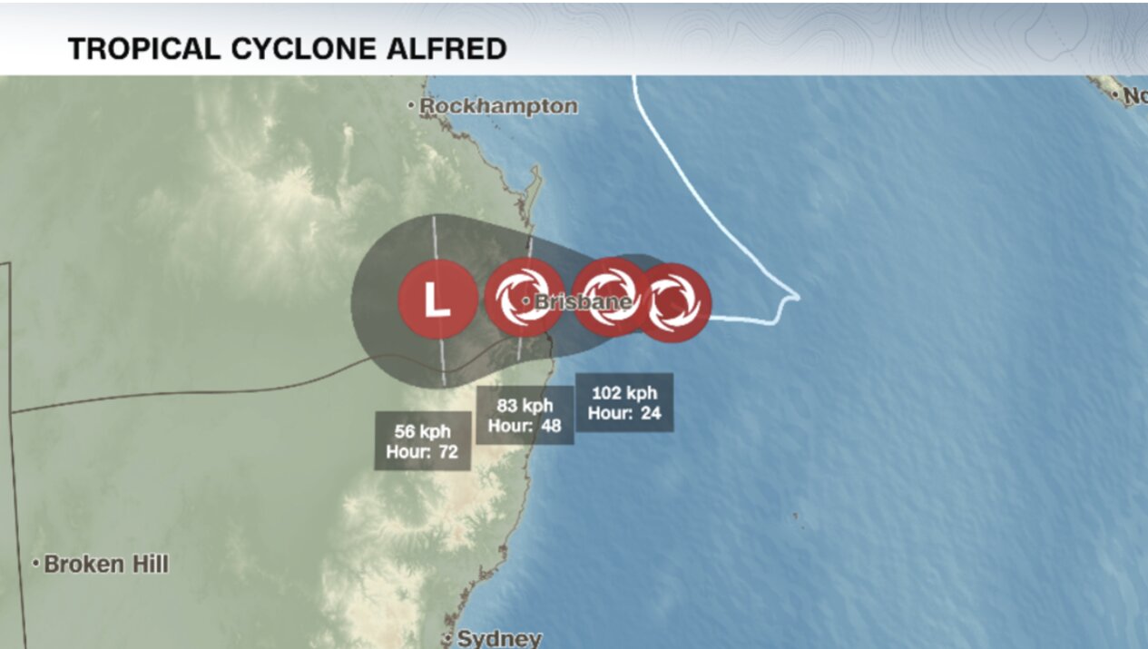 Tính đến thứ Tư, cơn bão Alfred chỉ cách bờ biển khoảng 400 km, di chuyển về phía tây với sức gió mạnh lên tới 120 km/h, theo Cục Khí tượng Úc (BoM). Nó đang di chuyển về phía bờ biển đông nam Queensland với tốc độ 16km/giờ.