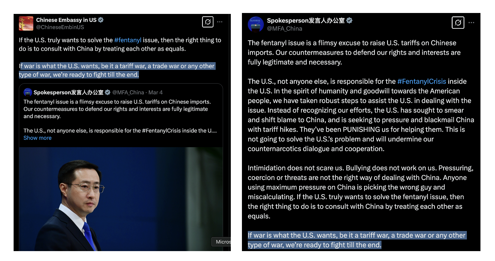 Người phát ngôn Bộ Ngoại giao Trung Quốc Lin Jian tuyên bố: “Nếu chiến tranh là điều Mỹ muốn, dù đó là chiến tranh thuế quan, chiến tranh thương mại hay bất kỳ loại hình chiến tranh nào khác, chúng tôi sẵn sàng chiến đấu đến cùng”. Tuyên bố này sau đó đã được Đại sứ quán Trung Quốc tại Mỹ nhắc lại trong một bài viết trên mạng xã hội X. Ảnh chụp màn hình mạng xã hội X