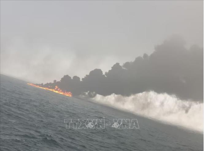 Khói lửa bốc lên tại hiện trường vụ va chạm giữa tàu chở hàng và tàu chở nhiên liệu trên Biển Bắc, ngoài khơi nước Anh ngày 10/3/2025.
