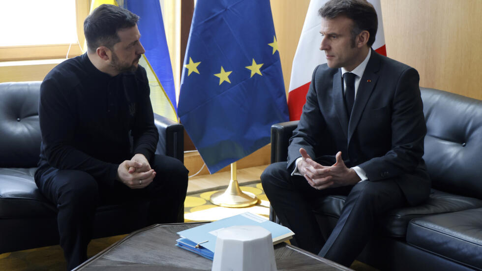 Tổng thống Pháp Emmanuel Macron (P) gặp tổng thống Ukraina Volodymyr Zelensky bên lề hội nghị của Hội đồng Châu Âu bàn về hỗ trợ Ukraina, tại Bruxelles, Bỉ, ngày 06/03/2025. AP - Ludovic Marin