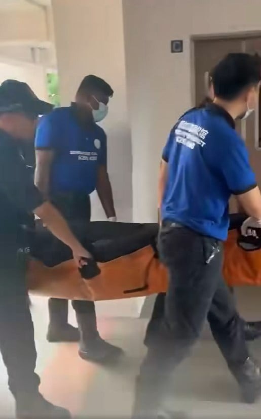 Thi thể của nạn nhân được đưa ra khỏi căn hộ và chuyển lên xe tang của cảnh sát. (Shin Min Daily News/ Facebook)
