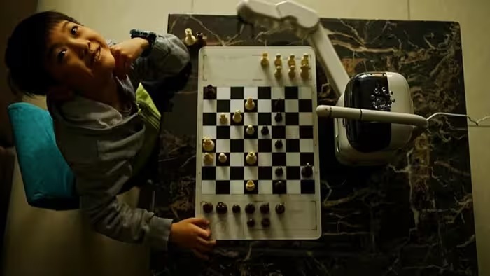 Cậu bé 8 tuổi Timmy đến từ Bắc Kinh (Trung Quốc) chơi cờ vua với robot tích hợp AI của hãng SenseRobot từ Hong Kong. Ảnh: BBC
