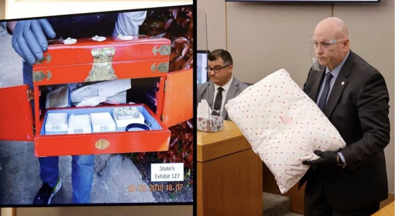 Hộp nữ trang và chiếc gối dính son được công tố viên đưa ra làm bằng chứng trước tòa. Ảnh: The Dallas Morning News