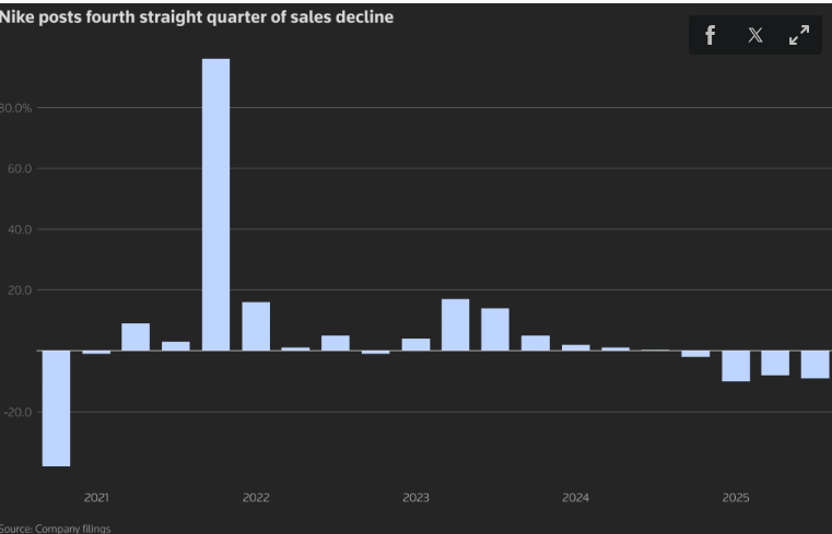Doanh số Nike giảm liên tục 4 quý tài chính gần nhất. Đơn vị: %. Đồ họa: Reuters