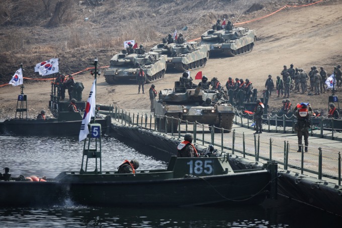 Binh sĩ Mỹ - Hàn diễn tập vượt sông trong cuộc tập trận chung Lá chắn Tự do ở Yeoncheon, Hàn Quốc ngày 20/3. Ảnh: Reuters