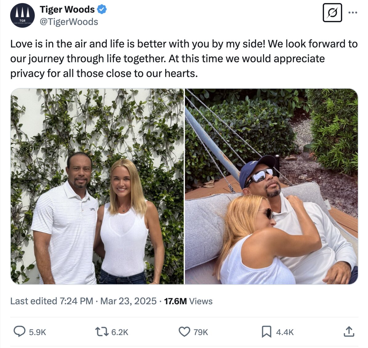 Tiger Woods xác nhận chuyện t́nh lăng mạn với thành viên gia đ́nh Trump