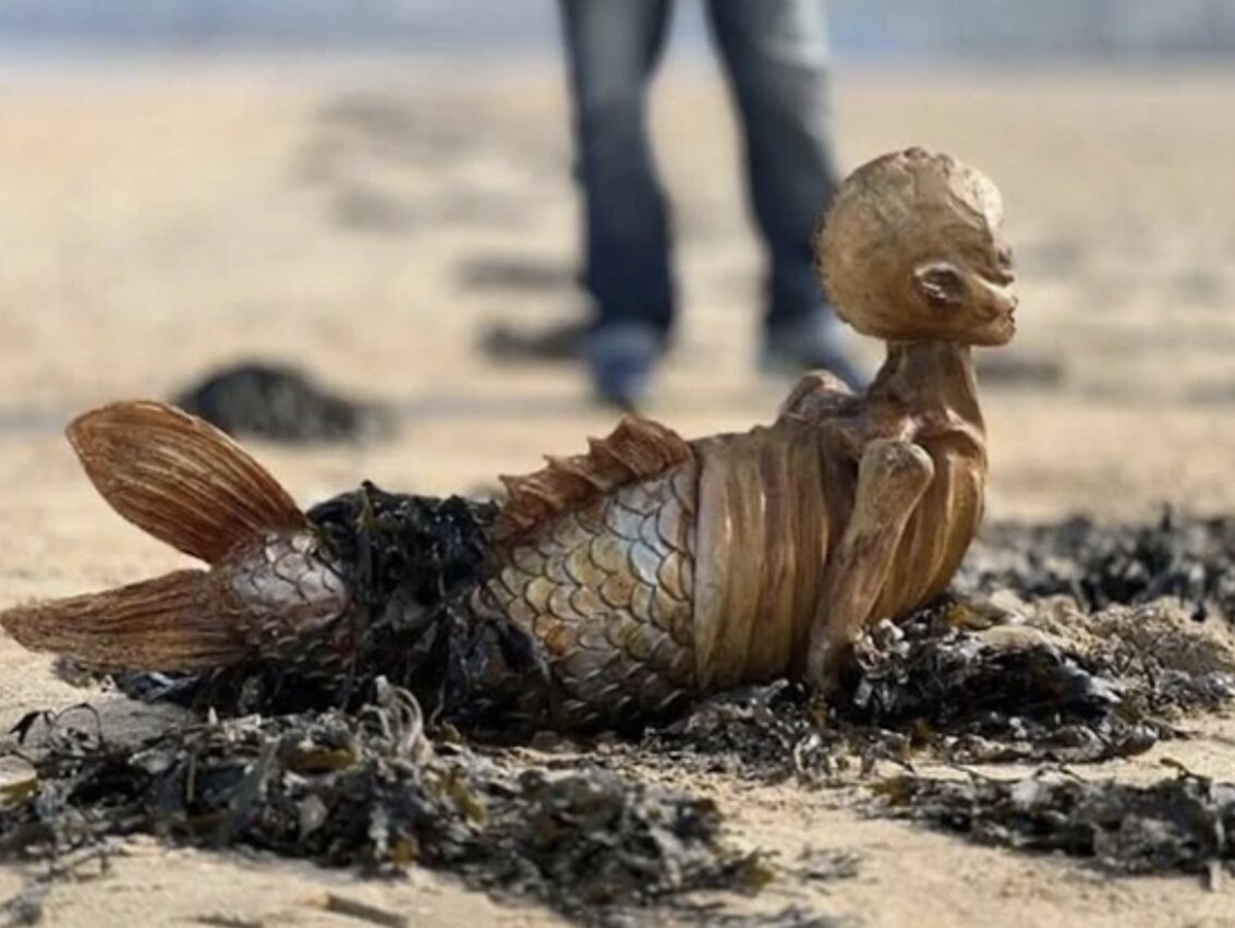 Những bức ảnh về sinh vật trôi dạt bí ẩn, một phần bị chôn vùi trong cát và được bao phủ bởi rong biển, cho thấy nó có một cái đầu hốc hác, giống người ngoài hành tinh, thân hình gầy gò và đuôi có vảy như một nàng tiên cá rùng rợn.