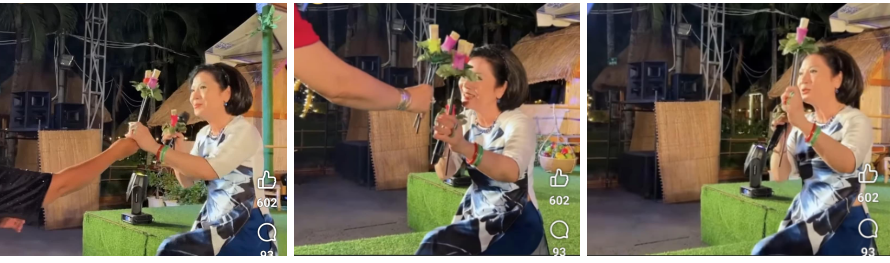 Kỳ nữ Mộng Tuyền quỳ gối khi nhận hoa của khán giả. Ảnh: Cắt từ clip Khương Dừa