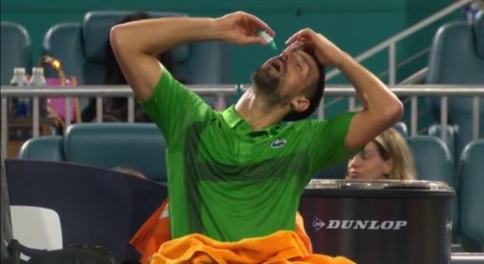 Djokovic dùng thuốc nhỏ mắt ở trận chung kết với Mensik, trên sân Hard Rock, Miami, Mỹ tối 30/3. Ảnh chụp màn hình.