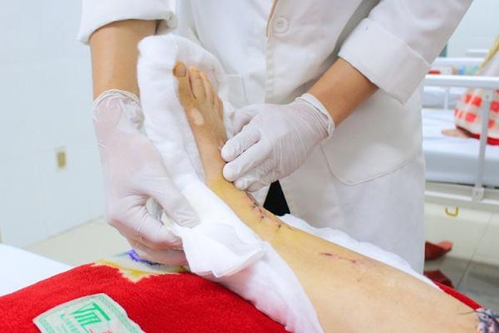 Sau cú ngã lúc đang đi bộ trong nhà, người phụ nữ 51 tuổi ở Long An bị lóc da mặt trước cổ chân phải, máu chảy nhiều, lộ gân cơ. Bệnh nhân được chẩn đoán đứt động mạch chày chân phải.