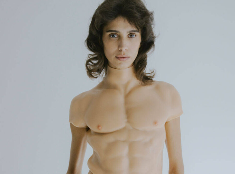 Nhưng đó vẫn không phải là tâm điểm của bộ sưu tập. Hai bộ phận cơ thể giả mới là điểm nhấn của buổi tŕnh diễn. Đầu tiên là cơ bụng sáu múi của người mẫu Mica Argañaraz. Tiếp theo là khoảnh khắc gây sốc: Chandler Frye, một người mẫu nam mới nổi, “diện” một bộ ngực nở nang, rung rinh bằng cao su.