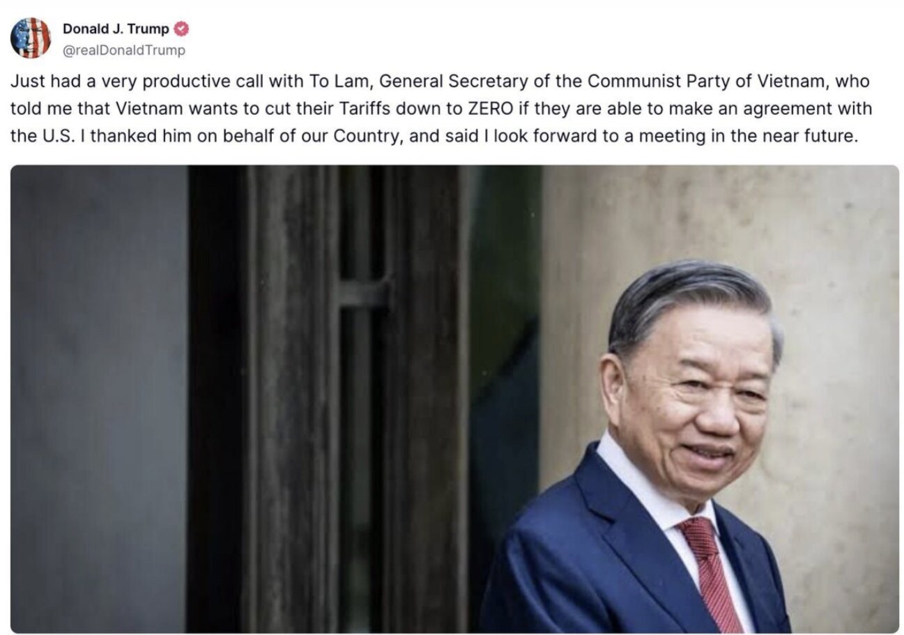 Chuyên trang đầu tư Investing giật dòng tít “Tổng thống Trump có 'cuộc điện đàm mang tính xây dựng' với Việt Nam…”. Trong đó nhấn mạnh về hiệu quả của cuộc điện đàm giữa Tổng Bí thư Tô Lâm và Tổng thống Hoa Kỳ Donald Trump.