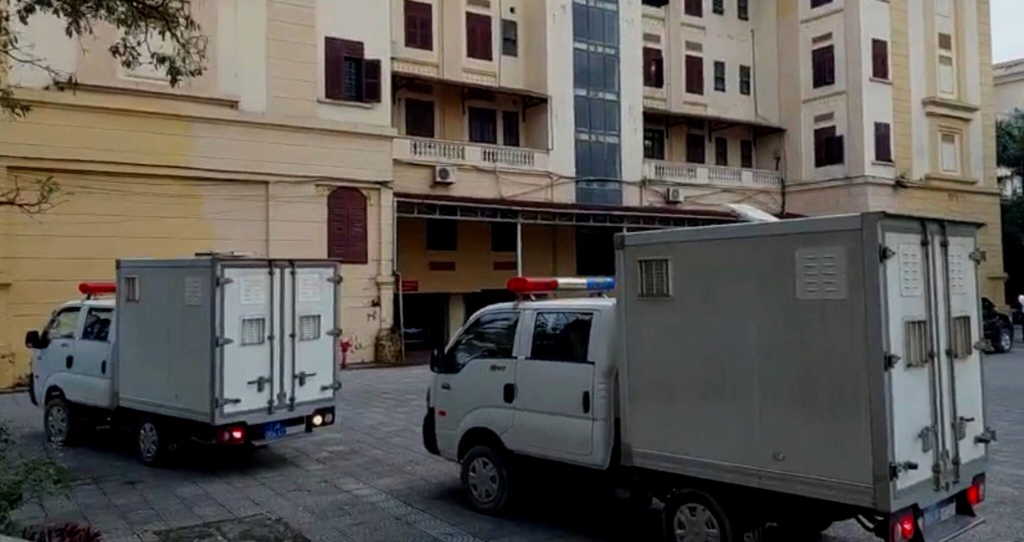 Xe chở nhóm bị cáo đến Tòa án Quảng Bình. (Ảnh: Quốc Nam/Tuổi Trẻ)