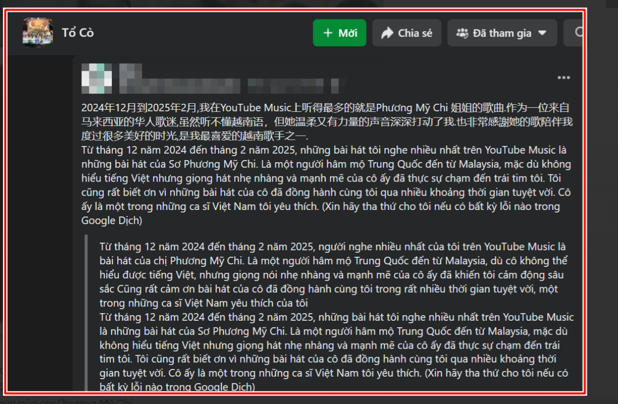 Mới đây, trong một hội nhóm FC của Phương Mỹ Chi trên Facebook, một bài viết đã bất ngờ trở thành tâm điểm chú ý của cộng đồng người hâm mộ. Điều làm nên sự đặc biệt của bài đăng này không chỉ nằm ở những lời khen ngợi đầy tình cảm, mà còn bởi danh tính người viết - một khán giả quốc tế đến từ Malaysia, gốc Trung Quốc. Không cùng ngôn ngữ, không chung văn hóa, nhưng chính âm nhạc của Phương Mỹ Chi đã trở thành "cầu nối" khiến trái tim xa lạ này rung động.