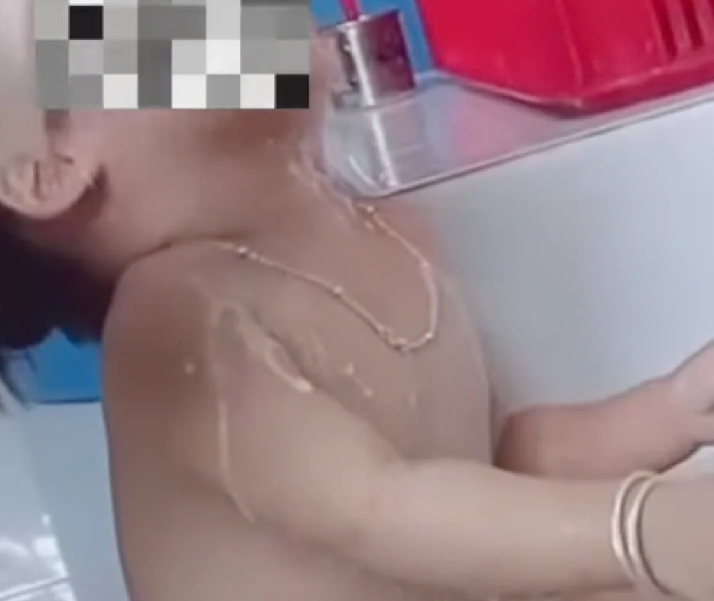 Theo nội dung đoạn clip, cô bảo mẫu dùng 2 tay, 1 tay nắm đầu trẻ ngửa lên, tay còn lại liên tục đổ đồ ăn vào miệng. Ảnh cắt từ clip