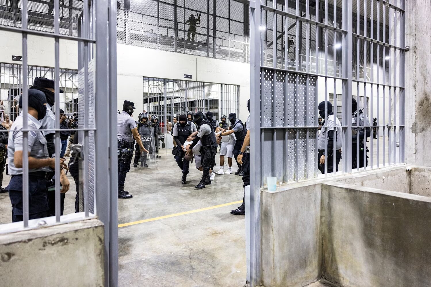 Lính canh nhà tù Salvador đang cho áp giải những thành viên bị cáo buộc của băng đảng Venezuela Tren de Aragua và băng đảng MS-13 vừa bị chính phủ Hoa Kỳ cho trục xuất tại nhà tù CECOT, ở Tecoluca, El Salvador ngày 12 tháng 4 năm 2025.(Ảnh: Reuters)