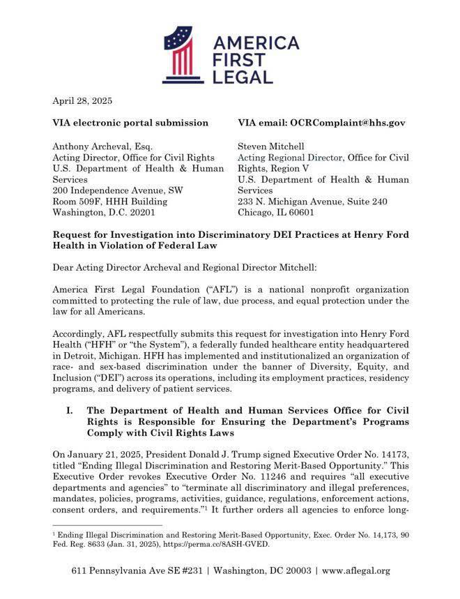 6-America First Legal (AFL) tố cáo bệnh viện Henry Ford Health nhận người làm , hay lựa chọn người phẫu thuật, hay cấp học bổng đều dựa trên màu da và giới tính - không phải chọn người giỏi hay có nhu cầu.