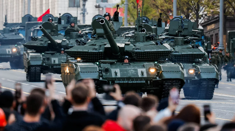Xe tăng Nga di chuyển dọc theo một con phố ở Moscow vào ngày diễn tập cho cuộc duyệt binh kỷ niệm 80 năm chiến thắng Đức Quốc xã, ngày 3/5.(Ảnh: Reuters)