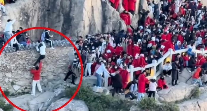 Muốn lách khỏi hàng khách du lịch đang kẹt cứng trên đường lên núi, một cặp đôi đã cố trèo qua vách đá và trượt ngã.