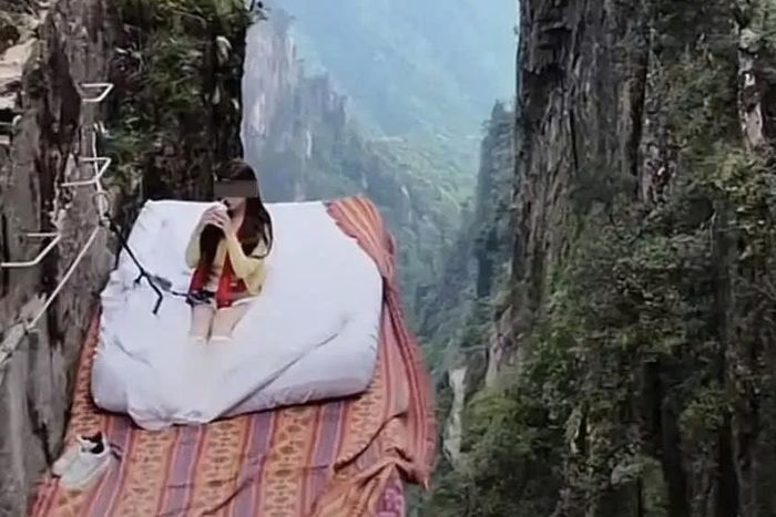 Trong kỳ nghỉ lễ Quốc tế Lao động (1/5), điểm check-in mang tên "vách đá cao 1.600 m" tại một khu danh thắng ở tỉnh Hồ Nam (Trung Quốc) thu hút sự chú ý với mô hình giường đặt sát mép vách đá dựng đứng. Theo Sohu, hình ảnh và video lan truyền trên mạng xã hội cho thấy chiếc giường có chăn, gối và dây an toàn, du khách tạo dáng như đang "ngủ lơ lửng" giữa không trung.