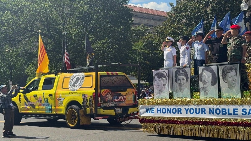 Khi phái đoàn , cầm biểu ngữ, toán quốc quân kỳ, xe hoa có những cô chú cựu chiến binh Việt Nam Cộng hòa , và hai nử quân nhân Mỹ gốc Việt , đứng lên chào và 1 xe hoa , 1 xe truck của Trường Giang , xe truck chở những lá cờ bay phất phới.